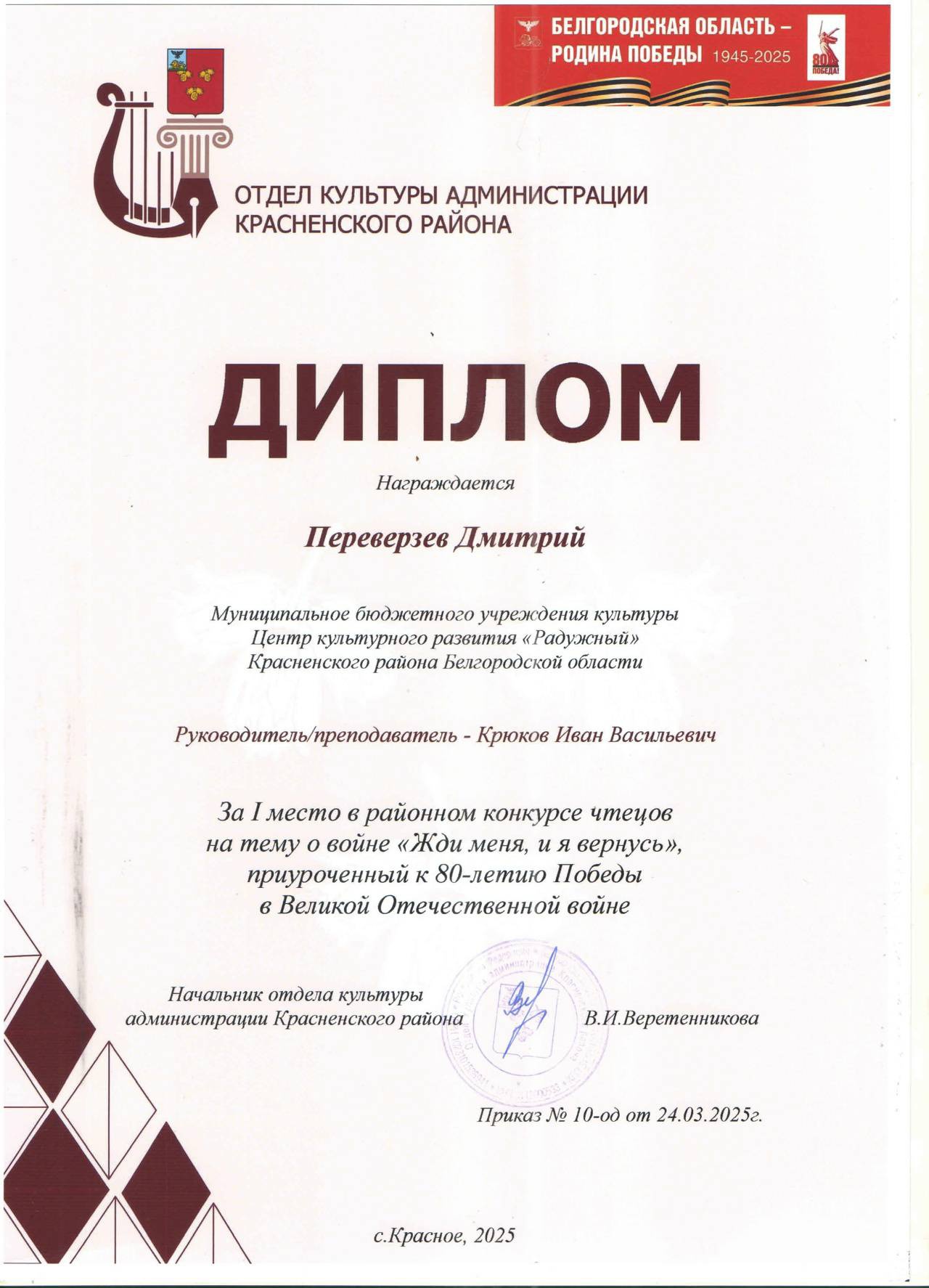Дорогие друзья! Мы рады сообщить, что участник театрального кружка «Диалог» Дмитрий Переверзев стал победителем районного конкурса чтецов «Жди меня, и я вернусь», приуроченного к 80-летию Победы в Великой Отечественной войне.