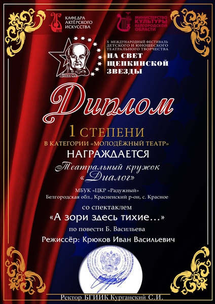 Театральный кружок «Диалог» под руководством режиссёра любительского театра Ивана Крюкова был удостоен награды – Диплома 1 степени в категории «Молодежный театр». Оригинальное прочтение произведения, художественно-образное решение спектакля, а также актёрская игра, покорили сердца зрителей и жюри.